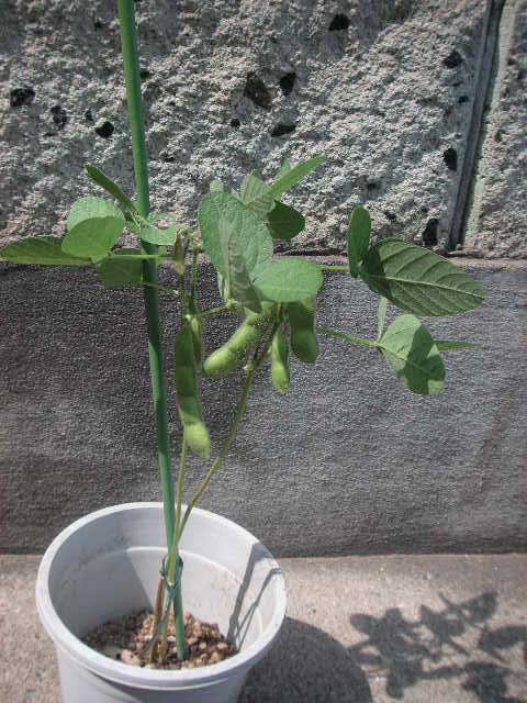 タネから育て、一番小さな鉢に2本仕立てにした枝豆も